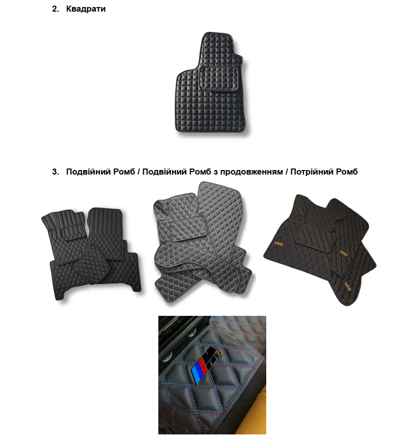 Ідеально лягають на своє місце, повторюючи кожну лінію в салоні. Виготовляються вручну за власними лекалами.